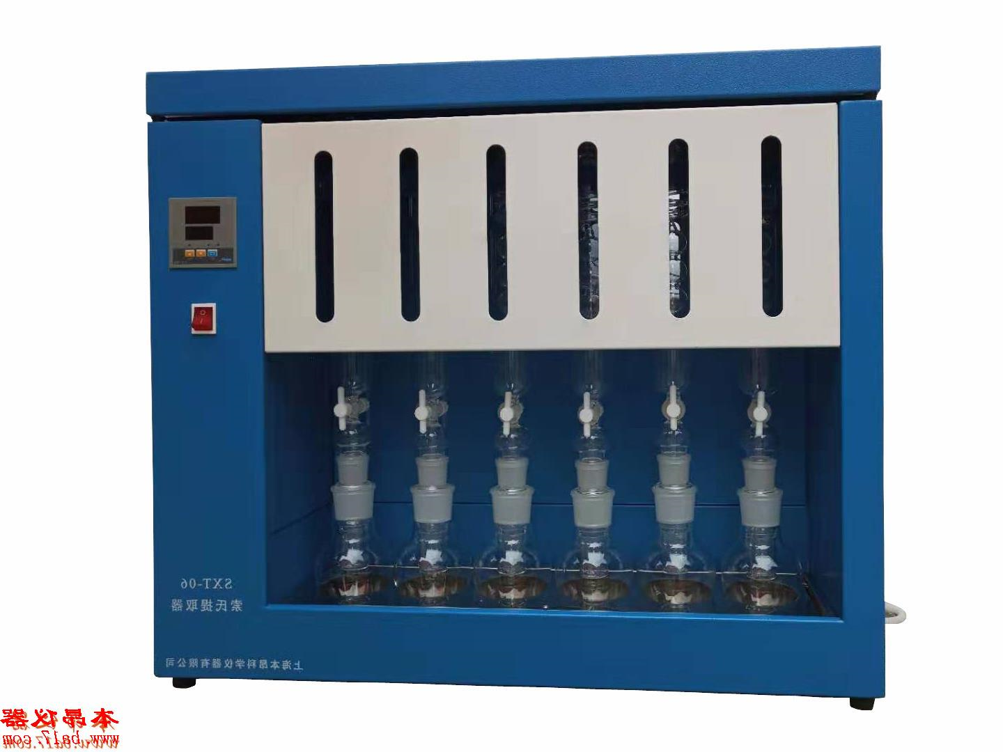 SXT-06索氏提取装置主要由加热提取,溶剂回收和冷却三大部分组成。操作时可以根据试剂沸点和环境温度不同而调节加热温度,试样在抽提过程反复浸泡及抽提,从而达到快速提取目的;本仪器可自动回收溶剂,大大方便了用户的使用,并节约了很多时间。