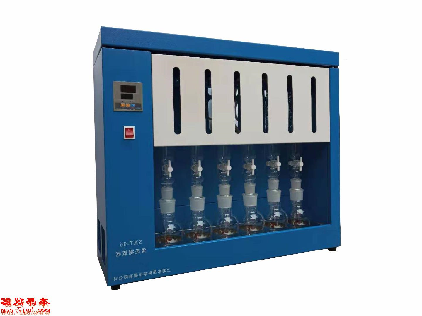 SXT-06索氏提取装置设计合理、性能稳定、精确度高、操作省力、省时。可同时提取6个样品,每个样品量为0-5g。自动回收溶剂,大大方便了用户的使用,并节约了很多时间。